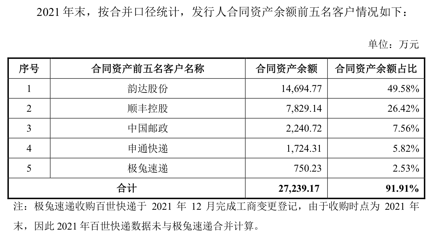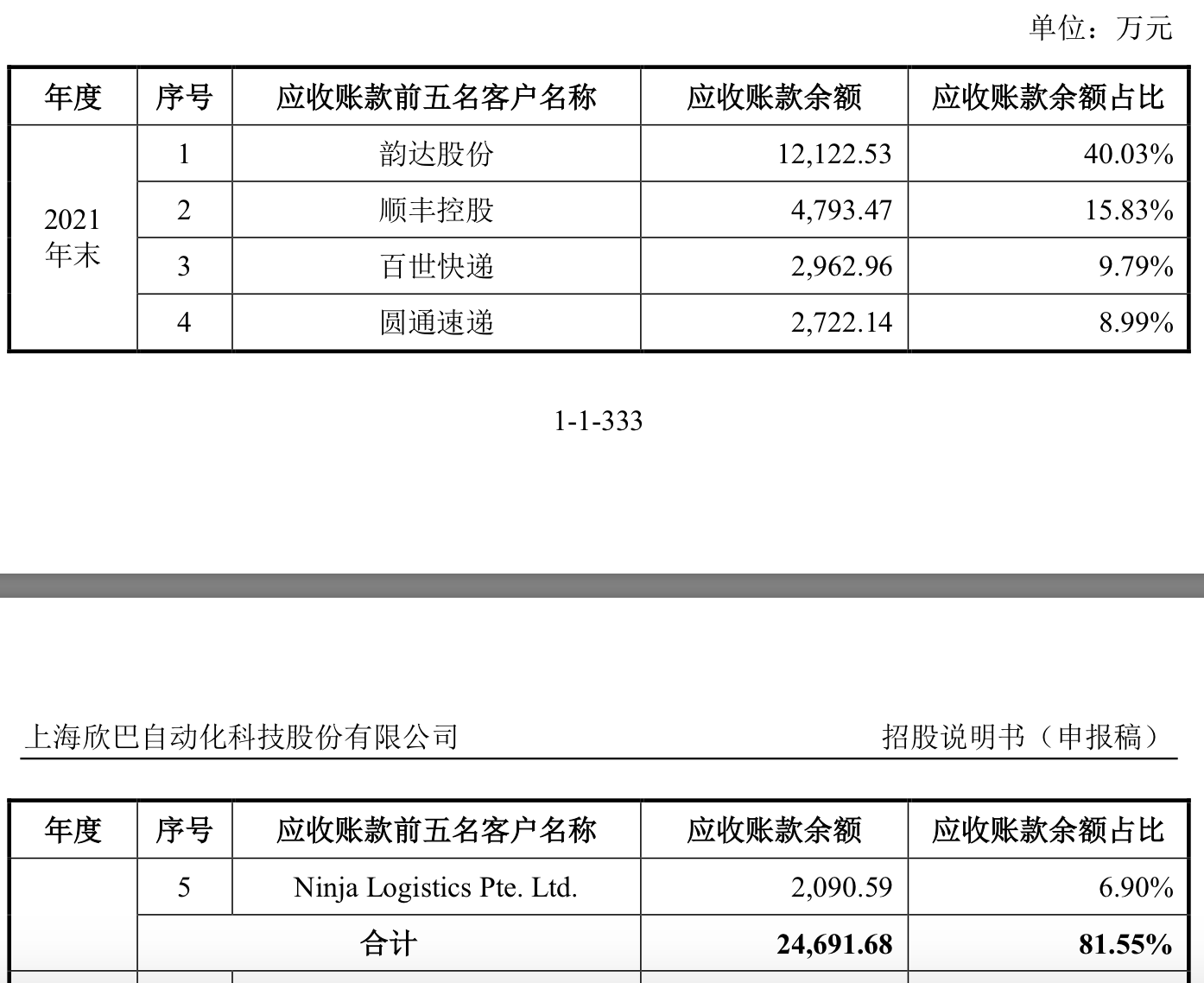 进一步看,2019年、2020年和2021年,按同一实际控制人合并口径计算,欣巴科技来源于前五名客户的收入占营业收入的比重分别为95.42%、85.56%和91.12%,其中来自于韵达股份(002120.SZ)的收入占比分别为65.05%、46.85%和46.03%,客户集中度相对较高。