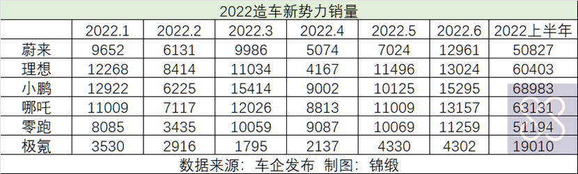 图:2022新势力造车销量表现 制图:锦缎