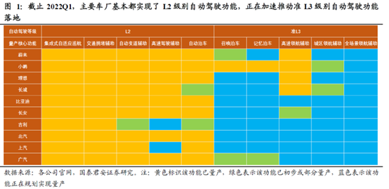 当前,新能源车的角逐已经来到了汽车智能化的下半场。其中,自动驾驶的等级是评价汽车智能化最直观的标杆。2022Q1,主要车厂都实现了L2的自动驾驶,正在加速推动L3级别自动驾驶功能落地。