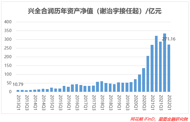 2013年1月29日起任兴全合润分级股票型证券投资基金(2021年1月起转型为兴全合润混合型证券投资基金)基金经理,当时规模是10亿元左右,至2022年一季度,基金累计回报率是588.55%,规模已是其接手时的近30倍,需要注意的是这一只基金的规模不是靠卖出来的,而是管出来的!