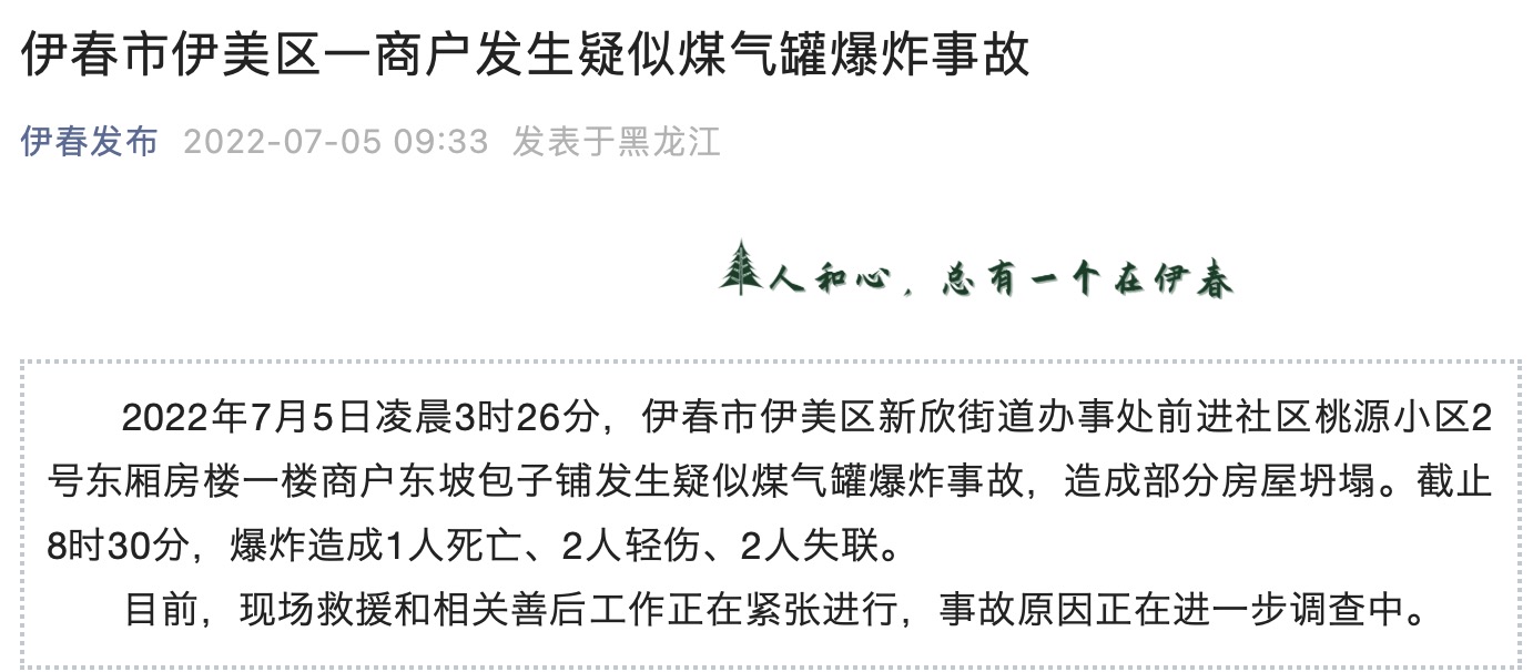 据“伊春发布”微信公众号消息,2022年7月5日凌晨3时26分,伊春市伊美区新欣街道办事处前进社区桃源小区2号东厢房楼一楼商户东坡包子铺发生疑似煤气罐爆炸事故,造成部分房屋坍塌。截止8时30分,爆炸造成1人死亡、2人轻伤、2人失联。