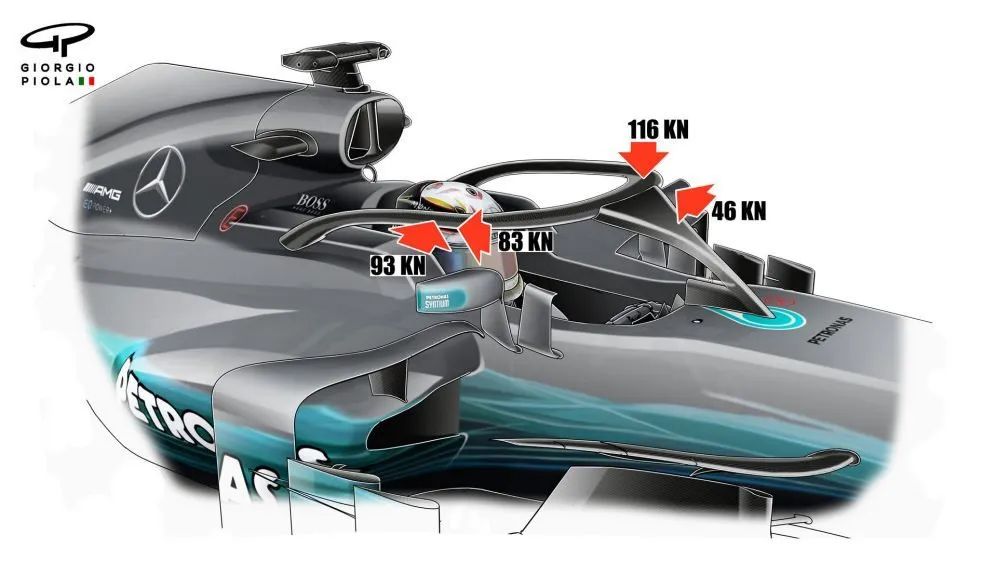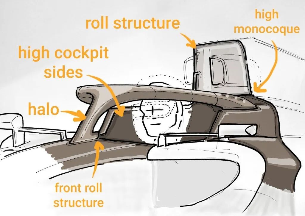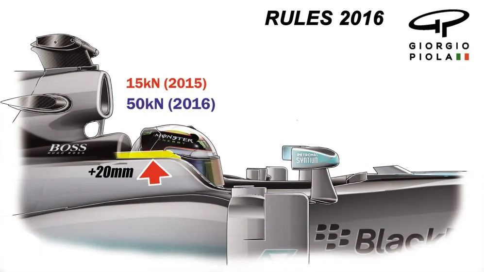 在2016年时F1座舱边缘的受力测试要求从15kN提升到了50kN,另外座舱两侧的高度也增加了20mm。