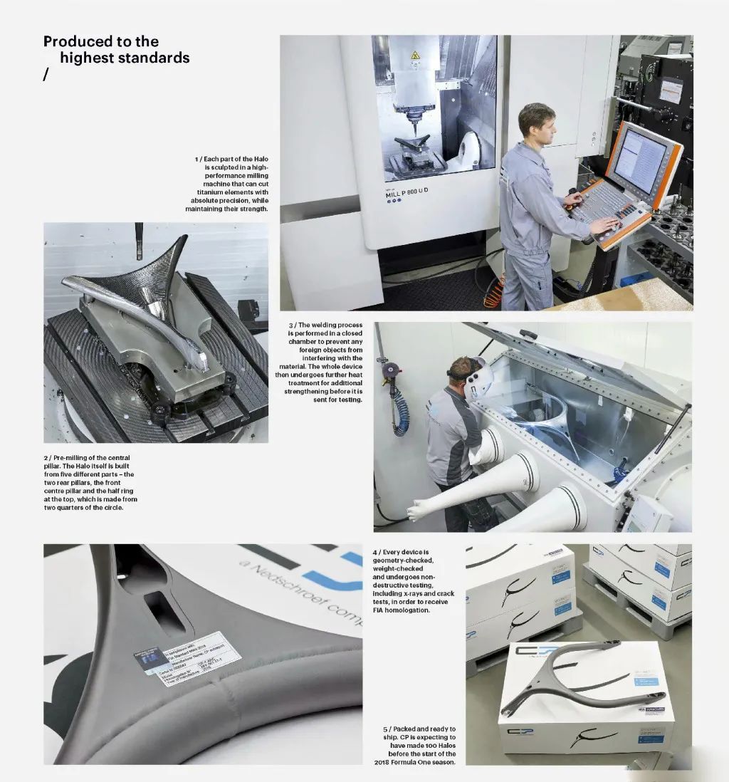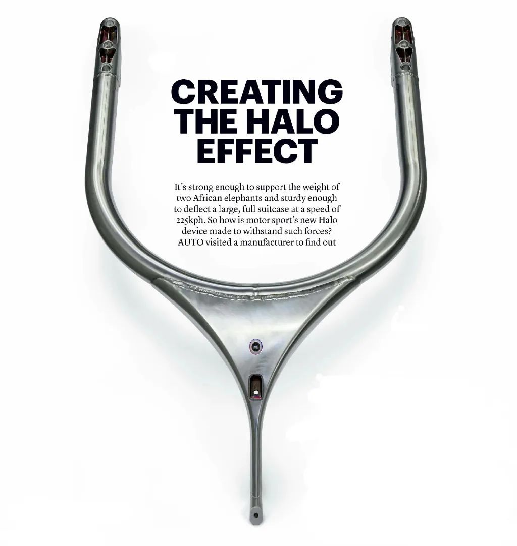 Halo以三点连接到车身,仅重9公斤,可承受约12000 公斤的重量(垂直和横向),由用于航空航天工业和人造骨骼的5级钛(Ti-6Al-4V)制成,整个Halo被分为5个部件,在无菌室中通过非常复杂的过程焊接在一起 ,单个Halo采购价格大约是1.5万欧元。