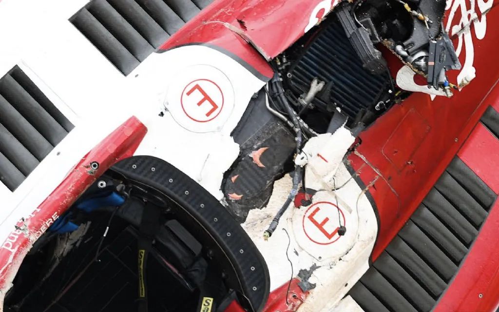 昨天在周冠宇的翻车事故中,周冠宇赛车的防滚架已经是磨掉了。防滚架失效,在防滚架磨掉之后,Halo开始撑着,以免周冠宇的头直接接触地面。