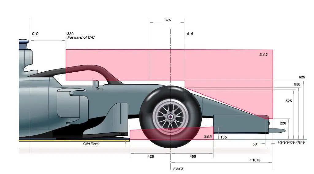 Halo的测试要求也很严苛,在C-C平面(即座舱后部)前方785mm处和基准面上方810mm处,施加相当于垂直向下116kN和纵向向后46kN的负载,且需要位于赛车中轴面上。