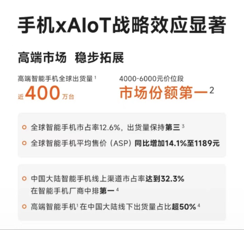 从小米公布的2022年Q1财报来看,小米手机一季度全球出货量3850万台。其中,中国大陆地区定价在3000元或以上及境外定价在300欧元或以上的高端智能手机全球出货量近400万台。ASP(全球平均售价)方面,小米手机为1189元,同比增长14.1%。