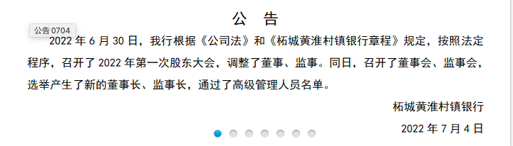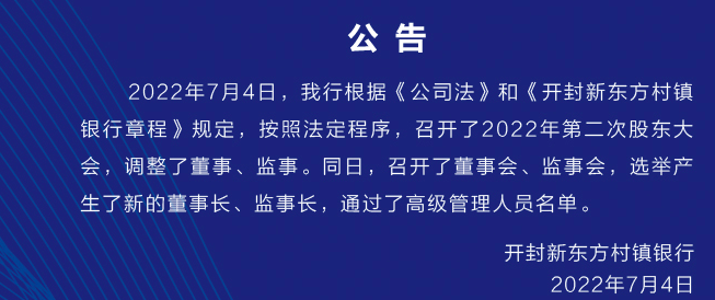 7月4日深夜,河南禹州新民生村镇银行、柘城黄淮村镇银行、上蔡惠民村镇银行、开封新东方村镇银行4家村镇银行在官网发布公告称,近日召开了股东大会、董事会、监事会,选举产生了新的董事长、监事长,通过了高级管理人员名单。从具体内容看,上述4家村镇银行的公告内容几乎一致。