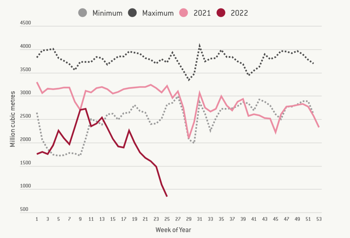 6月,俄罗斯削减了60%的“北溪一号”天然气供给量。北溪管道官网显示,7月11日-21日,“北溪一号”将因为进行年度检修完全停运。