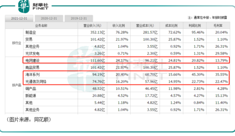 按产品划分,2021年,光通信业务实现营收74.76亿元,同比增长23.05%,毛利率为22.47%,同比下降9.39个百分点;电网建设业务实现营收111.6亿元,同比增长11.57%,毛利率为13.79%,同比减少0.13个百分点;海洋系列业务实现营收94.19亿元,同比增长101.82%,毛利率为35.55%,同比减少7.25个百分点;新能源业务实现营收20.88亿元,同比增长38.67%,毛利率为15.13%,同比增加7.66个百分点;铜产品实现营收48.52亿元,同比增长74.52%,毛利率为4.28%,同比增加了0.91个百分点;商品贸易实现营收101.42亿元,同比下降36.7%,毛利率为1.1%,同比增加0.27个百分点。