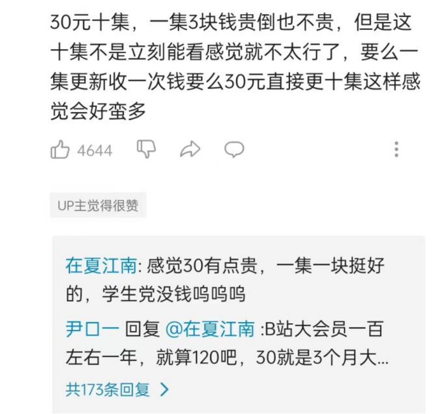 另外,正如用户所说,B站可以在后期正式开放阶段添加分集售卖选项,既能够降低用户的投入成本,也有利于在一定程度上减少因内容风险而造成的用户体验感下降;从UP主的角度来说,也可以减轻因用户一次性购买而产生的制作压力,避免后续翻车所带来的信誉崩塌。