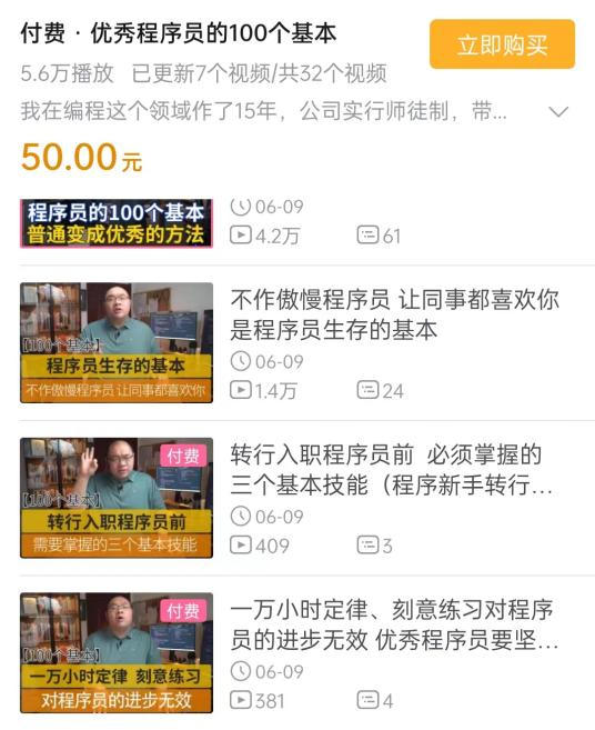 据了解,其实在邓肯之前,已经有五位UP主试水付费合集,其中不乏IT、音乐、舞蹈、摄影行业专业人员,UP主技术胖是第一位。6月9日,技术胖发布付费内容《转行入职程序员前必须掌握的三个基本技能(程序新手转行必看)》,32节课售价50元,尽管其视频在转为付费后收看人数骤降,但也吸引了400+人付款,粗略估计收入2万元左右。