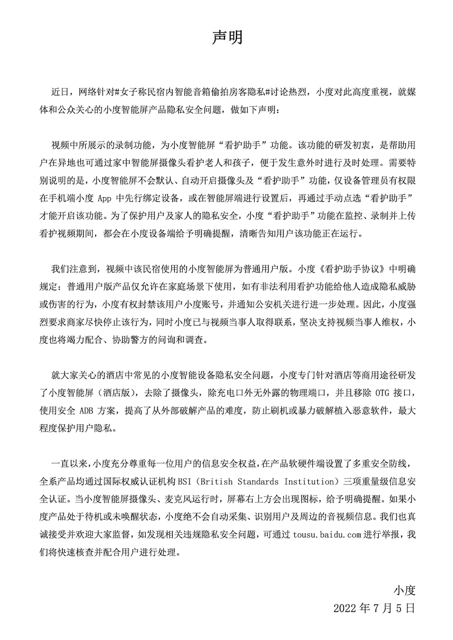 7月5日,@小度小度 就“女子玩智能音响发现多名房客被拍”事件发布回应称:强烈要求商家尽快停止该行为,已与视频当事人取得联系,支持当事人维权,并将竭力配合、协助警方的问询和调查。
