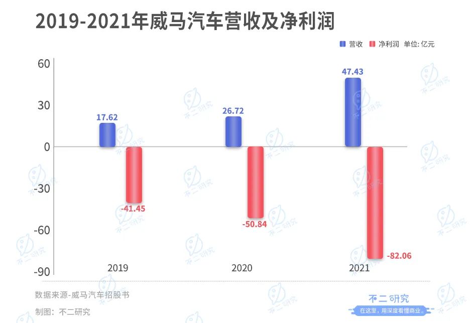 在营收增长的同时,威马汽车的亏损也在扩大。据其招股书显示,威马汽车2019-2021年的净亏损分别为41.45亿元,50.84亿元,82.06亿元,三年累计亏损174.35亿元。