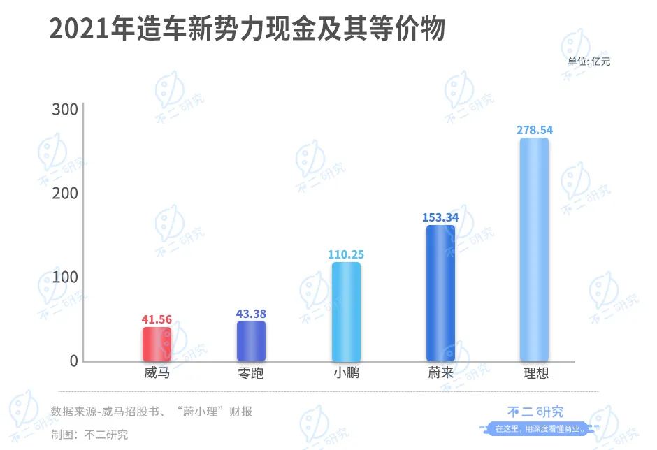 而据“蔚小理”的年报显示,蔚来、小鹏、理想同期的现金及现金等价物分别为153.34亿元、110.25亿元、278.54亿元,威马汽车的现金远低于“蔚小理”,甚至不及第二梯队的零跑汽车的43.38亿元。