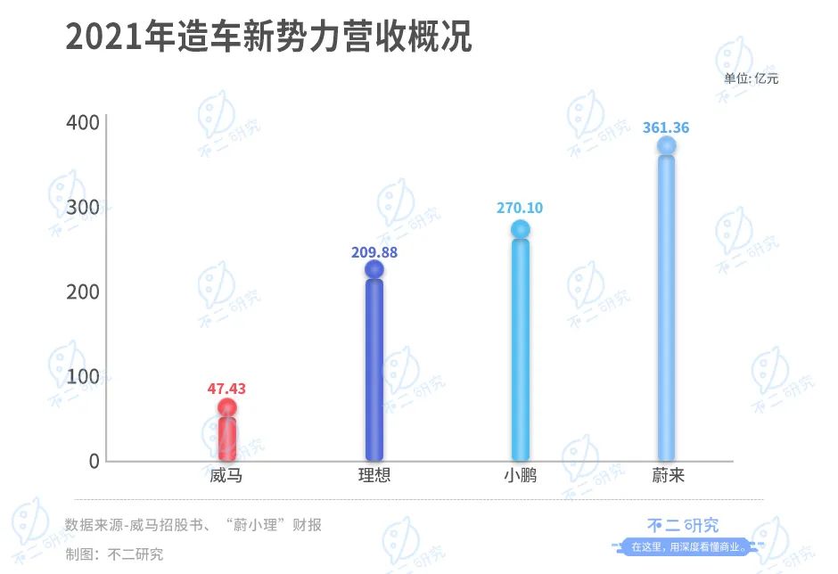 据招股书显示,威马汽车2019-2021年分别实现营收17.62亿元,26.72亿元,47.43亿元,2020年及2021年分别同比增长51.65%和77.51%。虽然实现增长,但与“蔚小理”相差甚远,据“蔚小理”财报显示,蔚来、小鹏、理想在2021年的营收分别为361.36亿元、209.88亿元、270.10亿元。