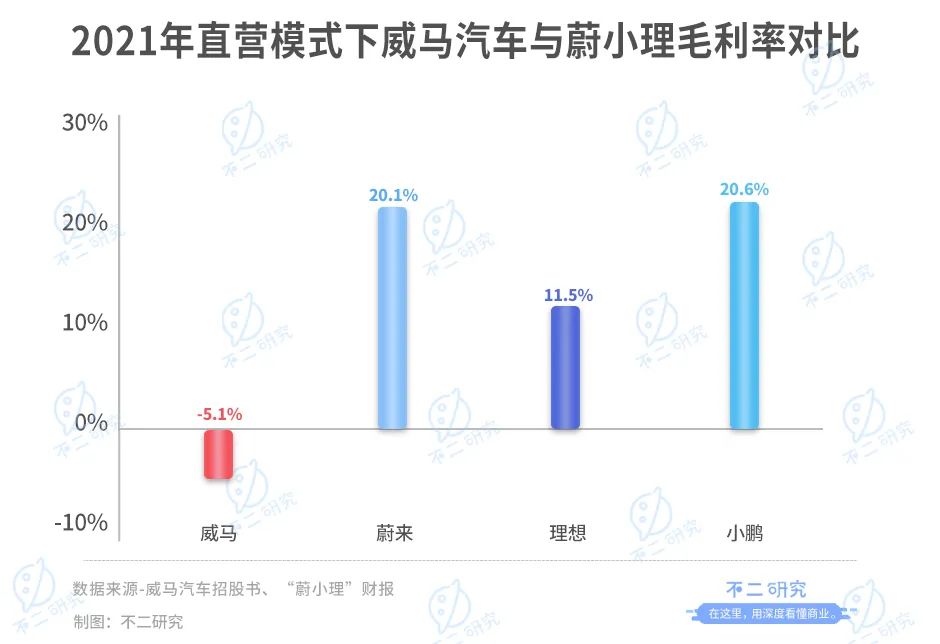 如果按照统一基准计算,2021年威马汽车的总收入为63.64亿元,毛利率应为-5.1%,但调整后与“蔚小理”的毛利率仍有一定差距,“蔚小理”早已在2020年就将毛利率转正,据各家招股书显示,2021年未来、小鹏、理想的毛利率分别为20.1%、11.5%、20.6%,远高于威马汽车。