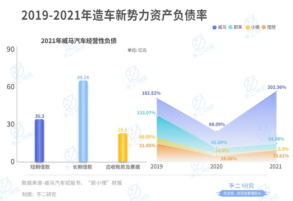 已经出现了资不抵债的迹象,据其招股书显示,2019-2021年威马汽车的资产负债率分别为182.52%,88.09%,202.36%,而据蔚小理的财报显示,2021年蔚来、小鹏、理想的资产负债率分别为54.08%,35.80%,33.61%,威马汽车的资产负债率远高于“蔚小理”。