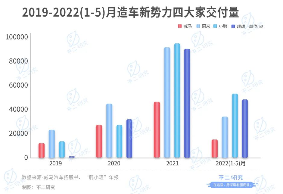 在2022年1-5月蔚来,小鹏,理想的交付量则分别为37886辆,53688辆,47379辆。威马汽车的交付量大幅落后于“蔚小理”。
