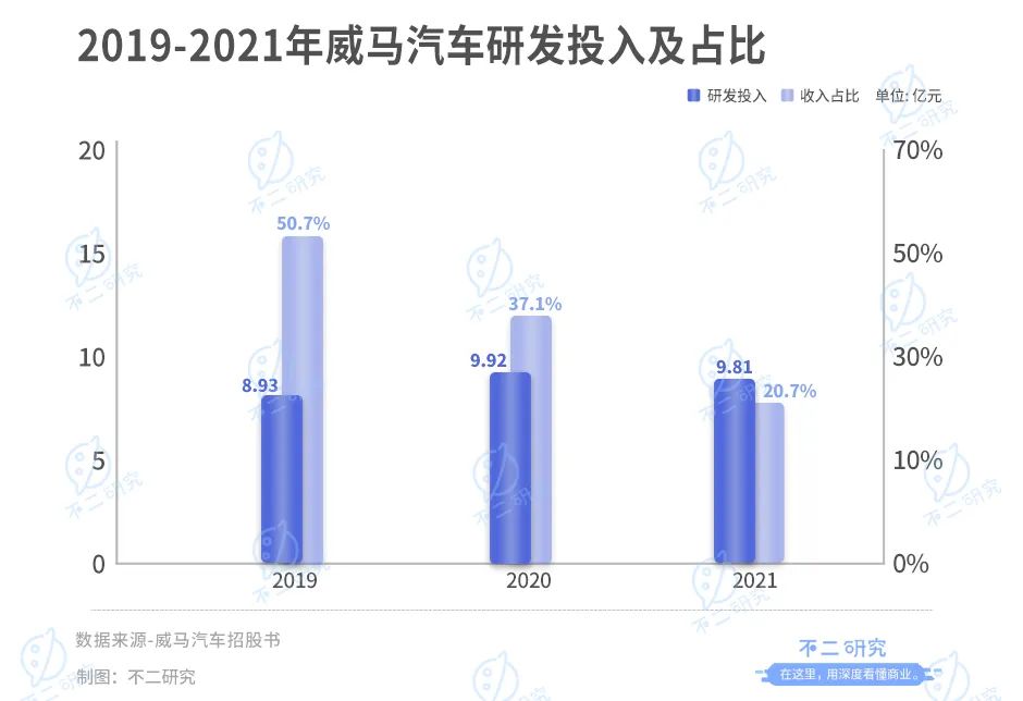 除此之外,威马汽车的研发投入亦显得十分薄弱。据其招股书显示,2019-2021年,威马汽车的研发投入分别为8.93亿元、9.92亿元、9.81亿元,三年间几乎无变化,占营收比例由50.7%降至20.7%。