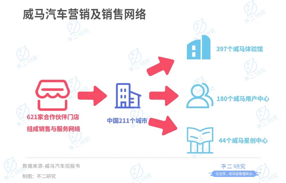 但是,因为威马汽车在渠道方选择的是“直营+经销商”模式,而非“蔚小理”的直营模式,据招股书显示,截至2021年12月31日,威马汽车已建成由621家合作伙伴门店组成的销售与服务网络,包括中国211个城市的397个威马体验馆(提供车辆展示而非销售)、180个威马用户中心及44个威马星创中心。