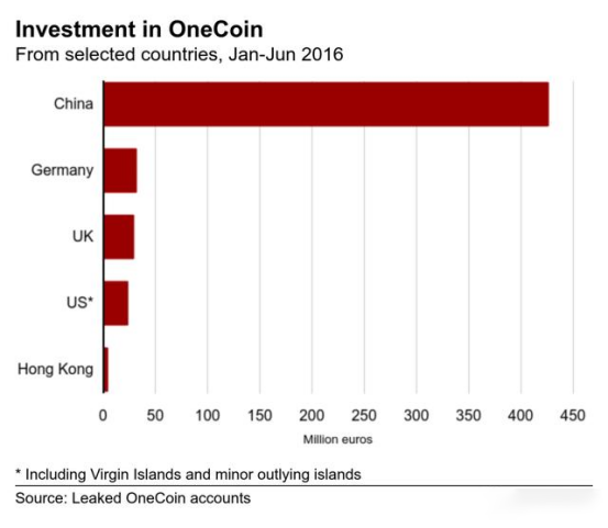 仅2016年1月到6月,Onecoin在中国大陆地区骗了4亿多欧元,在德国骗了3100多万欧元,在英国骗了3000多万欧元,在美国骗了2500多万欧元……