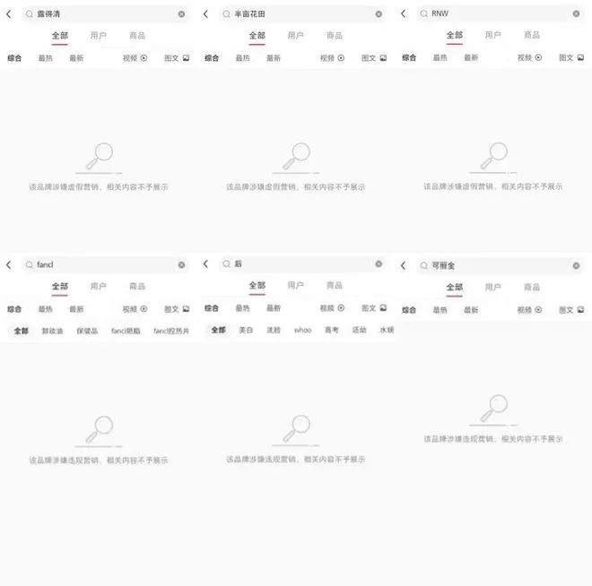 彼时,以品牌名为关键词,在小红书平台上搜索这些品牌,相关笔记内容无法显示,页面仅出现“该品牌涉嫌虚假营销,相关内容不予展示”的提示。