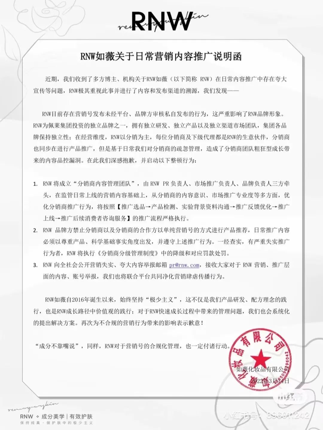 3月一解封,嗅到风头不对的Rnw品牌就火速发布公告表示,将成立专业团队,对“分销商(和分销商的合作方)日常营销内容”进行严加管理,公开了举报邮箱,以免被“猪队友”连累。