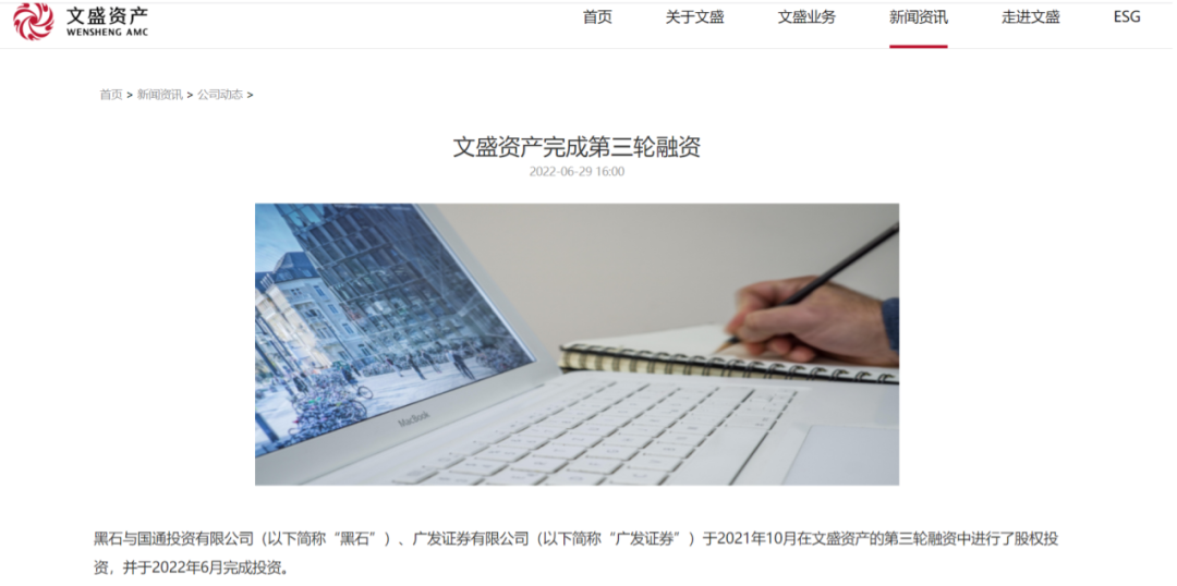 6月29日,文盛资产在官网宣布,黑石与国通投资有限公司、广发证券有限公司于2021年10月在文盛资产的第三轮融资中进行了股权投资,并于2022年6月完成投资。