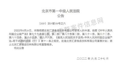 今年6月27日,汇源果汁宣布,汇源重整方案已在6月24日获得通过,由北京市第一中级人民法院裁定批准。
