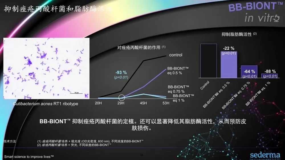 研究表明,该原料可以选择性抑制痤疮丙酸杆菌的过度增殖,降低由痤疮丙酸杆菌造成的炎症因子表达,同时不影响表皮葡萄球菌等皮肤常驻菌,从而促进和强化皮肤微生态的再平衡。