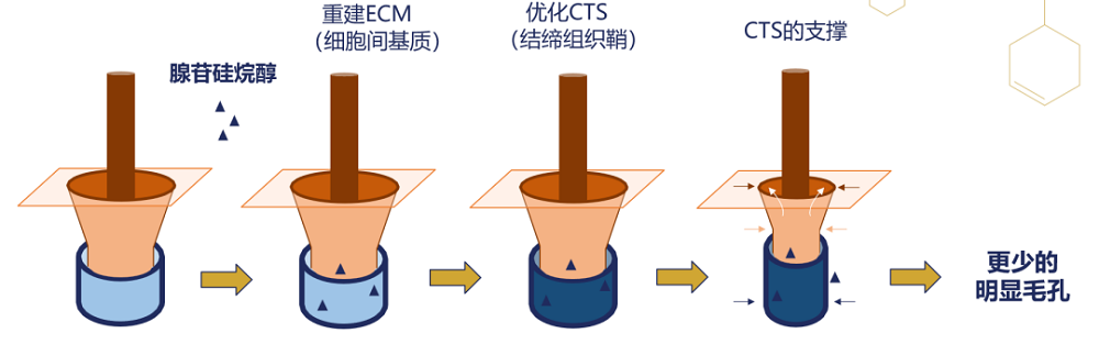 在皮肤老化、油脂分泌等影响下,皮肤细胞基质被降解,结缔组织鞘失去支撑而变得松弛,导致毛孔变粗大。在科学模型上进行测试,研究人员发现存在一种新的标记物MAGP-1,这是一种糖蛋白,可以优化毛孔周围的纤维网络。