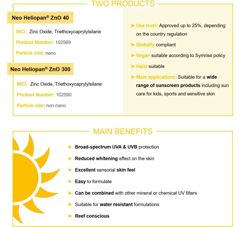 新的防晒剂系列包含两种基于氧化锌的广谱防晒剂:Neo Heliopan ZnO 40和 Neo Heliopan ZnO 300,这两种产品的INCI 名都是氧化锌、三乙氧基辛基硅烷。