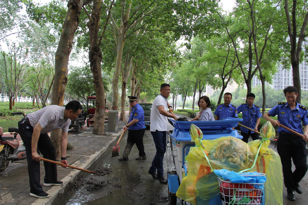 “用实际行动彰显城管人责任担当”。水退后的路面无论是车道还是人行道,淤泥多,让人无处下脚。积水区域还存在着大量的枯枝败叶阻挡在排水井上。王志文亲自用水枪一遍一遍冲洗着路面,一个排水井一个排水井地清理树枝。他说:“越是这种时候,我们城管人越是上下联动,全体动员,挺身而出,走在最前,打一场漂亮的攻坚战。”他们用城管人的实际行动为人民群众生命财产安全提供最有力、最坚实的保障。