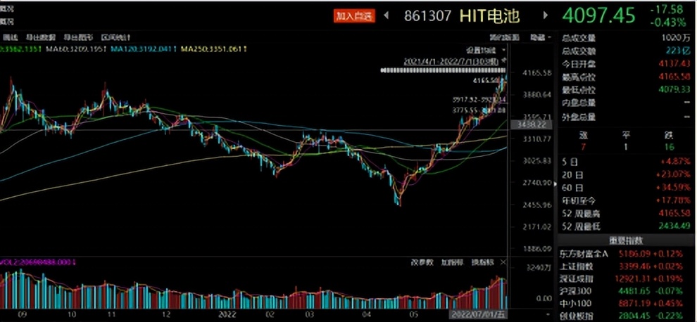 从上图HIT电池概念指数的近期趋势来看,目前已经创新高,风险已经逐渐大于机会,不排除HIT概念的炒作已经接近尾声。从今年4月27日概念跟随大盘触底后出现反弹后,截止7月1日,概念板块反弹幅度超过60%,成交金额过万亿,概念板块已经积累相当的收益。