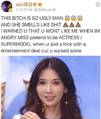 微博时不时就有明星互撕,不过昨晚这出比较火爆。昨天晚上,陈冠希陈老师突然在微博上贴了一张林志玲照片,并附上了一段非常恶毒的辱骂: