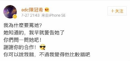 事后陈老师秒删微博,然而热心的围观群众都截图留念了,毕竟是个大新闻啊……后来过了一会后,陈老师对秒删的微博做了以下解释: