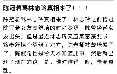 随后,有人爆出了陈老师怒喷林志玲的内幕。有一种说法是,林志玲把陈冠希女友秦舒培介绍给某富豪,让陈老师戴了绿帽子: