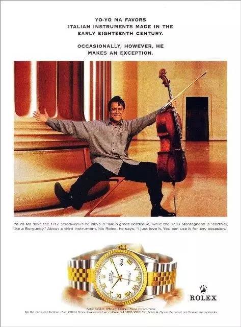 劳力士也有重视艺术人文的一面,自80年代末至千喜年之际,华裔旅美大提琴家马友友是劳力士的最佳代言人之一,近几年,国际知名钢琴家李云迪与王羽佳也加入了这个阵容。