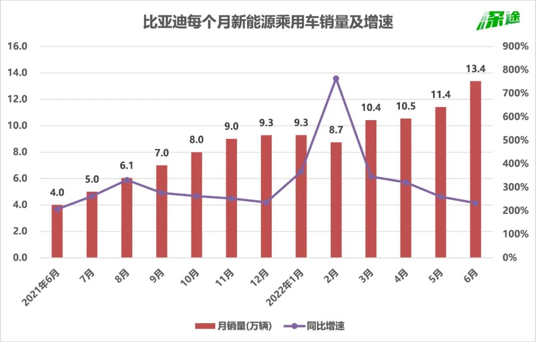 在秦PLUS DM-i之后,比亚迪宋、唐、元、海豚接棒,纷纷迈入月销过万阵营,宋甚至超过3万辆。在多款车型的助力下,比亚迪新能源车的整体月销量,以每个月净增1万辆的速度膨胀,然后在今年3月突破10万辆,5月突破11万辆,6月突破13万辆。