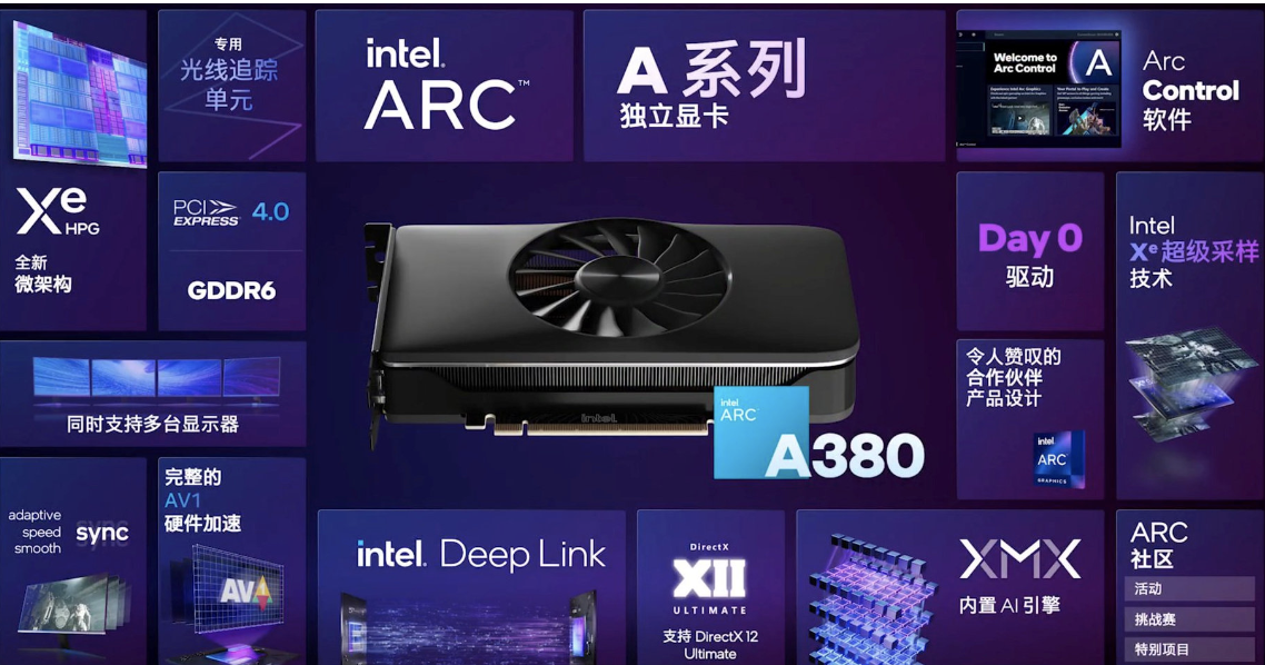 今年的入门级显卡参赛选手比往年还多了一位,那就是英特尔的A380,作为英特尔锐炫系列针对消费级市场发布的第一款独立显卡(此前在ODM市场已经有数款产品),参数方面颇为亮眼,拥有8个Xe-Core(未公开流处理器数量,有消息称为1024个),配有6GB GDDR6显存,显存带宽为96bit。