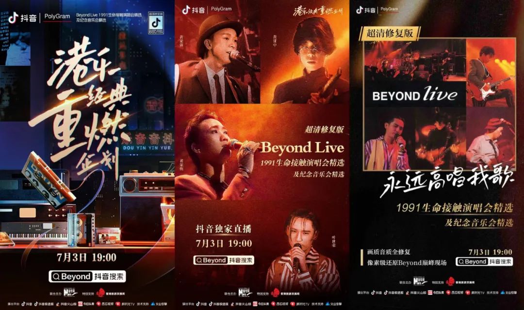 7月3日晚,香港摇滚传奇乐队Beyond高清修复演唱会在抖音开演,跨时空呈现了31年前1991年生命接触演唱会的精选片段,几代人的青春记忆被超清修复,两小时内就聚集了1.3亿人次在直播间为黄家驹“哭干眼泪”。