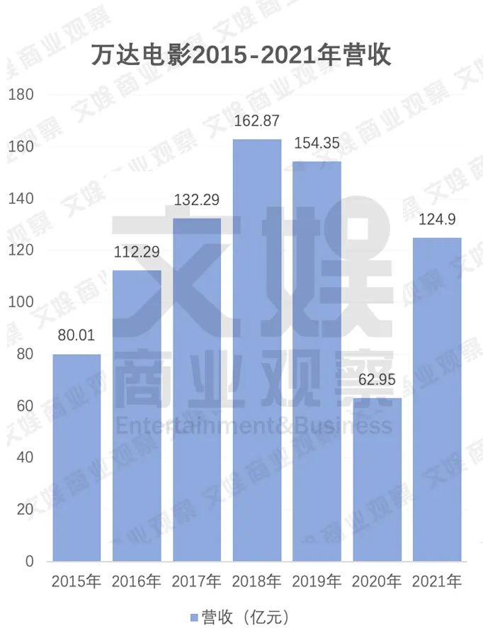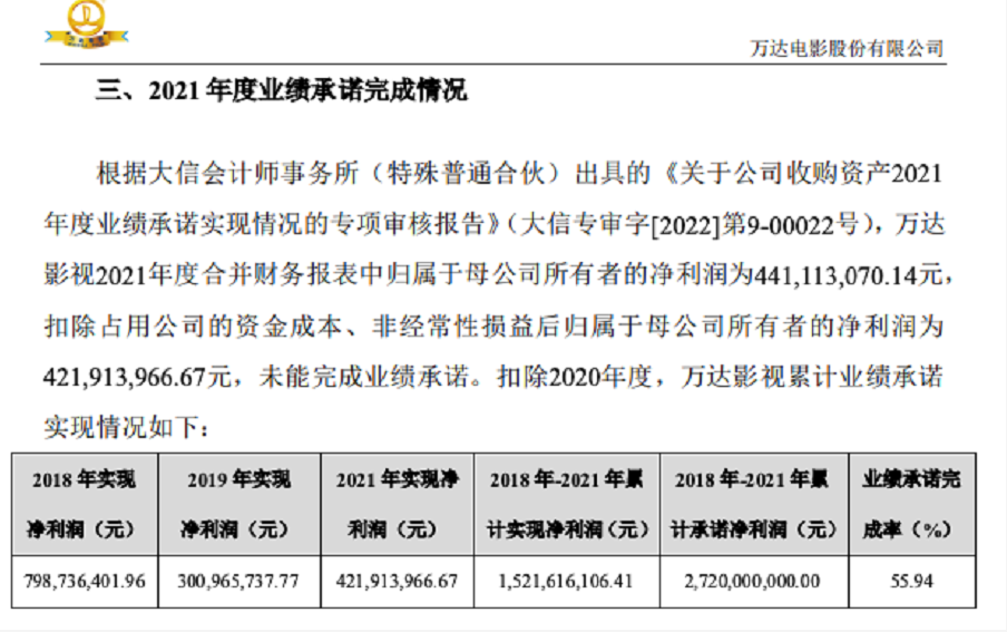 业绩承诺方面,2020年因为疫情不可抗因素,原定于2021年到期的业绩承诺延期到2022年结束。因此实际纳入计算的业绩承诺只有2018年、2019年和2021年3年,这三年万达影视累计实现业绩15.22元,是承诺业绩27.2亿元的55.94%。