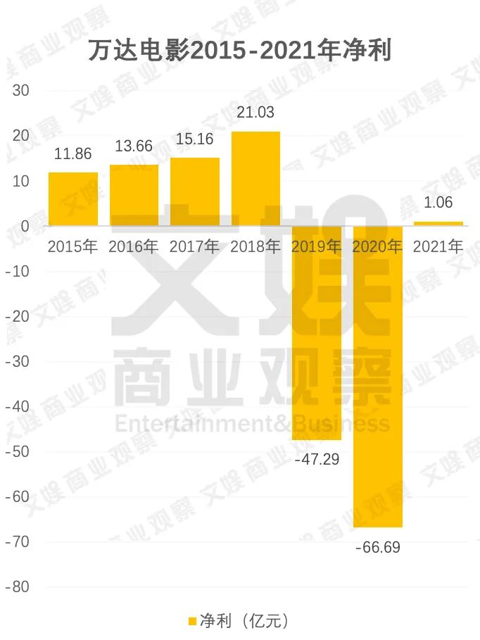 相较于营业收入,万达电影的净利润犹如过山车般。刚上市的2015年净利润11.86亿元,2019年开始巨额亏损,达到47.29亿元,2020年借着疫情再次调减商誉亏损达到创纪录的66.69亿元,2年合计亏损达到110亿元,完全抹去历年净利润。