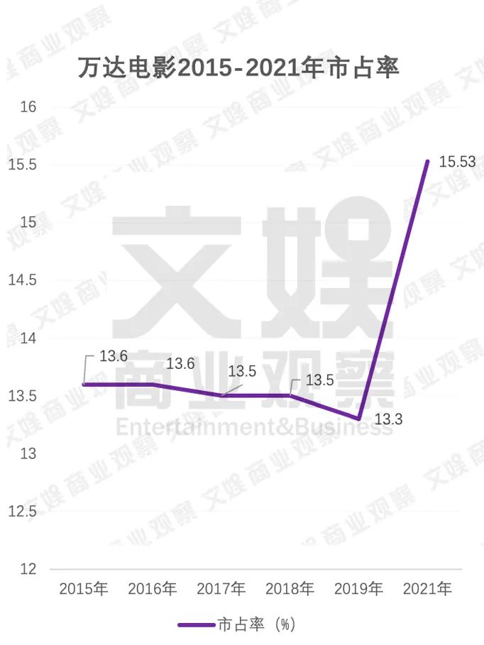 2015年上市之时,万达电影院线版块的市占率为13.6%,此后连续5年都徘徊不前,没有大的进展;直到2020年疫情促使万达院线大力发展加盟店,以自营为主、加盟为辅的发展模式带动了市占率的提升,在2021年达到15.53%,连续13年成为国内院线市占率第一的头部院线品牌。