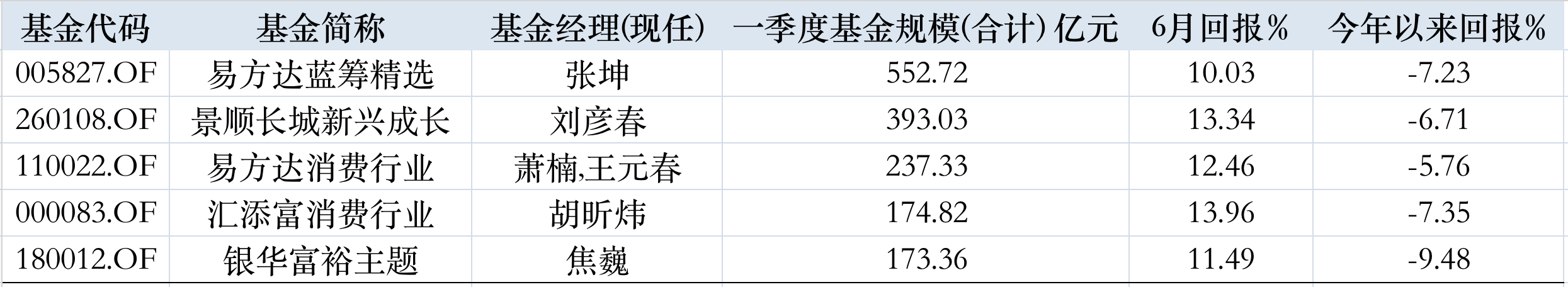 伴随行情回归,沉寂已久的大消费基金正逐步走出阴霾。以重仓消费板块且规模居前的顶流产品为例,体量较大的5只主动权益类基金6月份涨幅均超10%,其中由胡昕炜管理的汇添富消费行业涨幅居首,单月回报为13.96%;刘彦春管理的景顺长城新兴成长紧随其后,单月收益为13.34%。