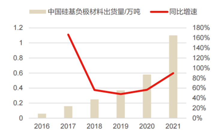 2016年,我国硅基负极材料出货量仅为 0.06万吨,2021年出货量激增,达1.1万吨,同比上升89.7%。同时,国内硅基渗透率仍然较低。据统计,2021 年中国硅基负极材料在负极渗透率仅为1.4%,提升空间巨大。