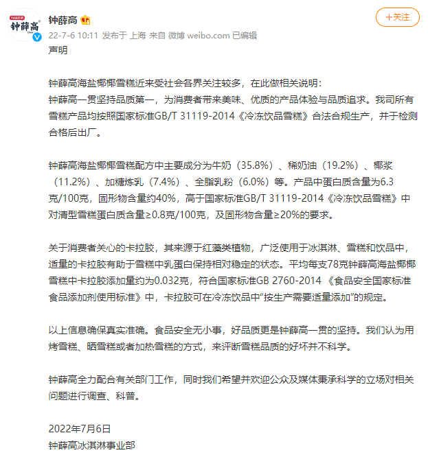 钟薛高7月6日在官方微博发布声明称,钟薛高海盐椰椰雪糕近来受社会各界关注较多,公司所有雪糕产品均按照国家标准GB/T 31119-2014《冷冻饮品雪糕》合法合规生产,并于检测合格后出厂。关于消费者关心的卡拉胶,其来源于红藻类植物,广泛使用于冰淇淋、雪糕和饮品中,适量的卡拉胶有助于雪糕中乳蛋白保持相对稳定的状态。平均每支78克钟薛高海盐椰椰雪糕中卡拉胶添加量约为0.032克,符合国家标准GB 2760-2014 《食品安全国家标准食品添加剂使用标准》中,卡拉胶可在冷冻饮品中“按生产需要适量添加”的规定。