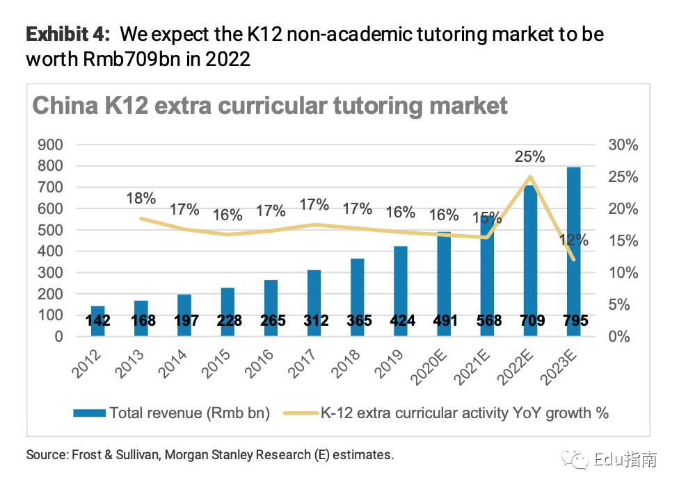 另一方面是素质教育为主的非学科类辅导市场预期增长。根据摩根士丹利预测数据,随着市场对以素质教育为主的非学科辅导需求增加,尤其是年轻学生兴趣增加,非学科辅导市场规模2022年增速将达25%,达到7090亿元人民币(2021年为5680亿元人民币)。各大公司谨慎按照合规要求,在该增长市场为用户提供服务。