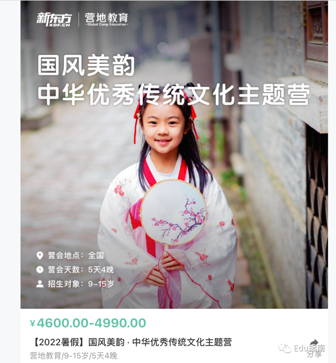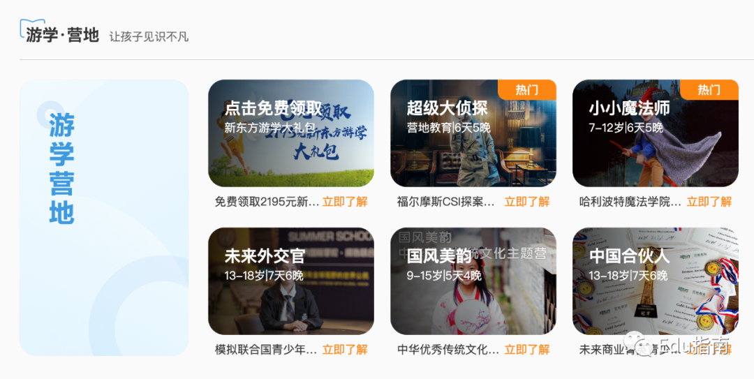 除致力于知识文化与脑力类素质素养课程,游学营地,户外素质拓展,成为新东方公司另一项重要体验式培养类别。根据官网,当前有超级大侦探(营地教育)、小小魔法师、未来外交官、国风美韵(传统文化)、中国合伙人(商业)等主题营。