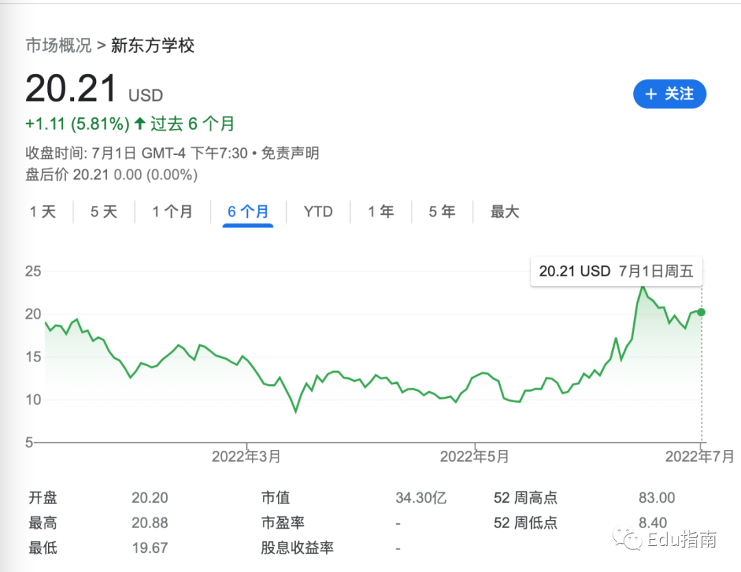 新东方公司过去半年,市值上升5.8%,当前市值为34.3亿美元。